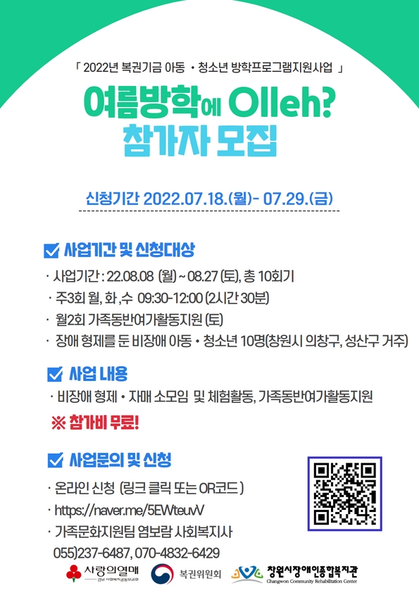 「2022년 복권기금 아동•청소년 방학프로그램」 공모사업으로 진행되는 비장애 형제•자매 대상의 여름방학 소통프로그램 참가자를 모집합니다! :D