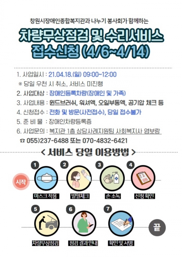 나누기 봉사회와 함께 하는 장애인 차량무상 점검 및 수리서비스가 오는 4/18(일) 복지관 앞마당에서 진행될 예정입니다,