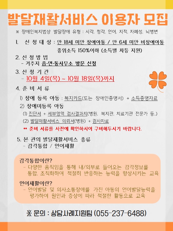 창원시장애인종합복지관에서 제공하고 있는 치료바우처 중, 발달재활서비스 이용자 모집 건이 있어 안내드립니다.