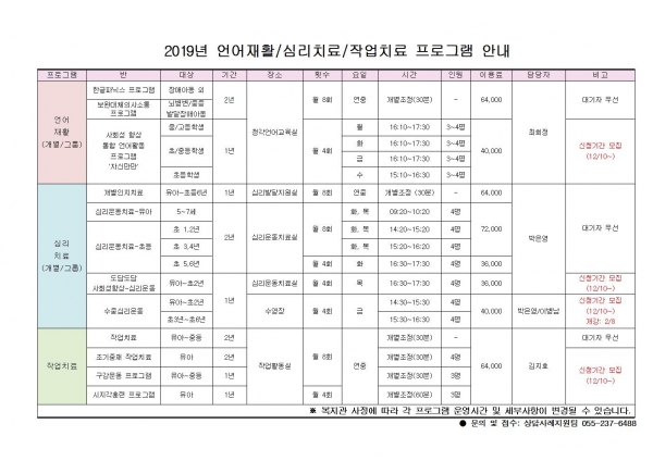 공지사항 2019년 언어재활/심리치료/작업치료 프로그램 안내 페이지 정보 작성자 운영자 댓글 0건 조회 7,442회 작성일 18-12-06 10:46 본문 이전글2019년 언어활동 프로그램 이용자 모집 안내 18.12.06 다음글2019년 물리치료 프로그램 안내 18.12.06 목록 댓글목록 댓글목록 등록된 댓글이 없습니다.