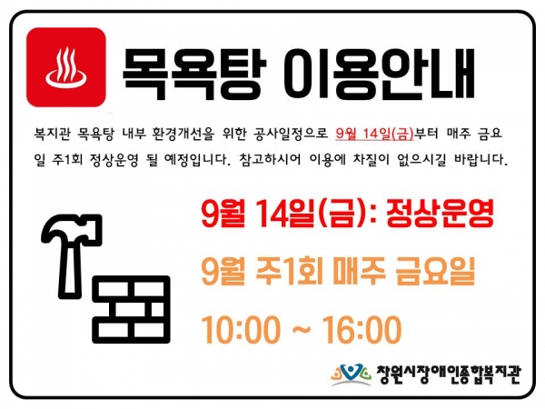 복지관 목욕탕 내부 환경개선을 위한 공사일정으로 9월 7일(금)은 휴무이며,