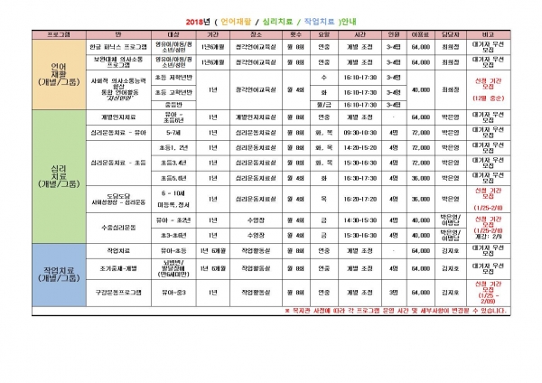 공지사항 2018년 ( 언어재활 / 심리치료 / 작업치료 )안내 페이지 정보 작성자 운영자 댓글 0건 조회 10,982회 작성일 18-01-26 18:04 본문 이전글120봉사회순회서비스 18.02.12 다음글2018년 문화여가 프로그램 이용자 모집 18.01.26 목록 댓글목록 댓글목록 등록된 댓글이 없습니다.