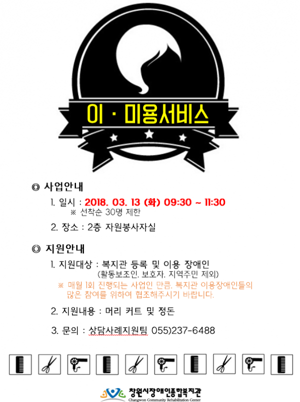 창원시장애인종합복지관에서는 월 1회, 복지관 등록/이용 장애인을 대상으로 이미용 서비스를 진행하고 있습니다.