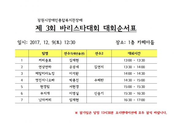 2017년 제 3회 창원시장애인종합복지관장배 바리스타 대회 참가팀은 12시30분에 실시되는 오리엔테이션에 전원 참석 바랍니다.