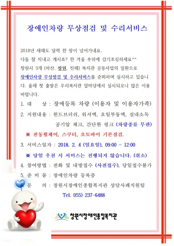 공지사항 장애인차량무상점검 및 수리서비스 페이지 정보 작성자 전관제 댓글 0건 조회 11,393회 작성일 18-01-24 17:01 본문 이전글사랑의자장면 나누기 Day 18.01.25 다음글2018년 부모교육 참가 안내 18.01.23 목록 댓글목록 댓글목록 등록된 댓글이 없습니다.