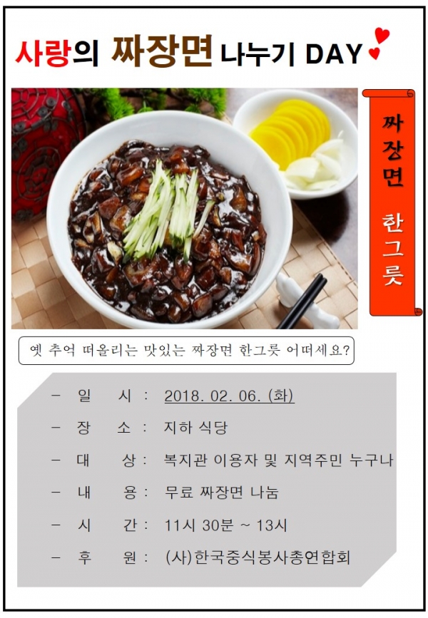 공지사항 사랑의자장면 나누기 Day 페이지 정보 작성자 전관제 댓글 0건 조회 10,824회 작성일 18-01-25 13:47 본문 이전글2018년 재가복지서비스 사업 설명회 18.01.25 다음글장애인차량무상점검 및 수리서비스 18.01.24 목록 댓글목록 댓글목록 등록된 댓글이 없습니다.