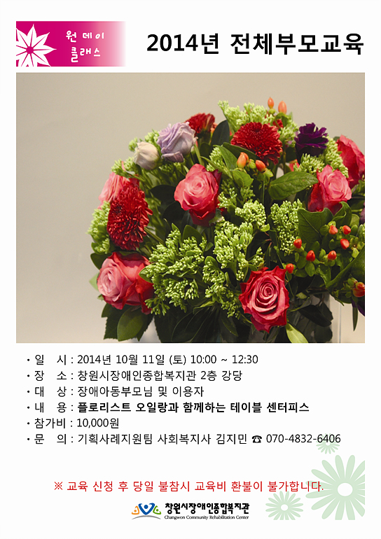저희 창원시장애인복지관에서는 장애아동 부모님과 이용자를 대상으로 아래와 같이 2014년 전체부모교육을 실시합니다.