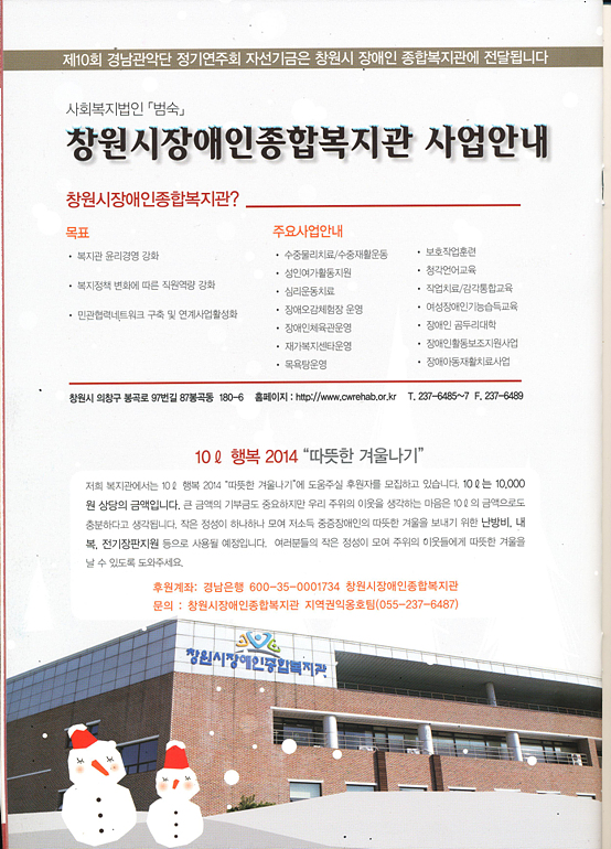 이번 제10회 경남관악단 정기연주회는 자선기금 마련을 위한 공연인데요. 공연 전, 휴식시간에 출입구 기부함에 넣은 자선기금을 저희 복지관에 전달해 주기로 하였습니다.