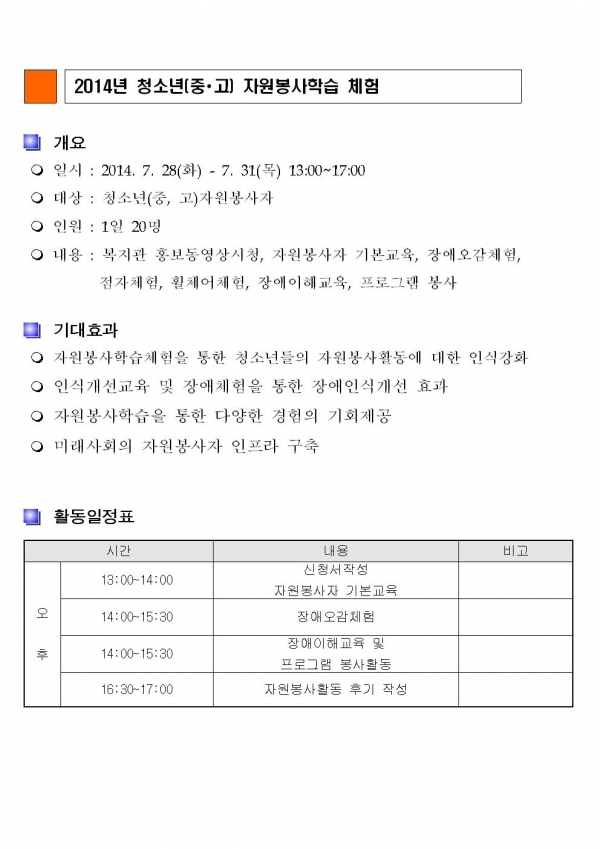 공지사항 2014년 청소년(중고) 자원봉사학습 체험 참가자 모집 페이지 정보 작성자 안병용 댓글 0건 조회 11,862회 작성일 14-07-23 10:11 본문 2014년 청소년(중∙고) 자원봉사학습 체험 참가자를 모집하고 있습니다. 청소년 여러분 많은 참가바랍니다. 이전글직원채용(장애인응급알림e서비스사업) 사회복지사 서류전형 합격자 공고 14.07.24 다음글사랑나눔 통합캠프 참가자 모집 14.07.22 목록 댓글목록 댓글목록 등록된 댓글이 없습니다.