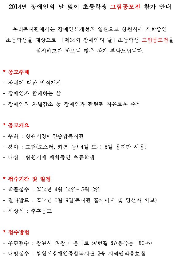 공지사항 초등학생 그림공모전 참가 접수 안내 페이지 정보 작성자 안병용 댓글 0건 조회 11,679회 작성일 14-04-11 14:05 본문 첨부파일 그림공모전 신청서.hwp (23.0K) 이전글동화구연교실 “동화랑 연극이랑“ 모집 안내 14.04.18 다음글범한산업(주) 정영식 대표이사, 1천만원 지정기탁 14.04.11 목록 댓글목록 댓글목록 등록된 댓글이 없습니다.