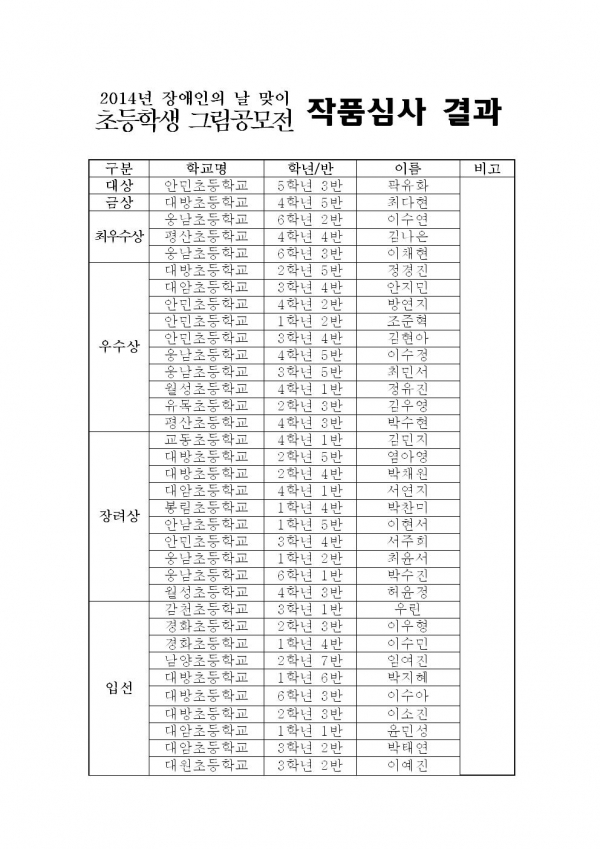 공지사항 제34회 장애인의 날 맞이 초등학생 그림공모전 당선작 발표 페이지 정보 작성자 안병용 댓글 0건 조회 13,616회 작성일 14-05-13 15:05 본문 제34회 장애인의 날 맞이 초등학생 그림공모전 당선작 발표 이전글2014년 하계 사회복지 전문인력 양성을 위한 실습생 모집 14.05.22 다음글초등학생 그림공모전 당선작 발표 연기 안내 14.05.08 목록 댓글목록 댓글목록 등록된 댓글이 없습니다.