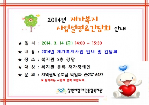 공지사항 2014년 재가복지사업 설명&간담회 개최 페이지 정보 작성자 안병용 댓글 0건 조회 12,349회 작성일 14-03-11 14:15 본문 [2014년 재가복지사업 설명&간담회 개최] 이전글120봉사회 순회서비스 봉사활동 14.03.13 다음글2014년도 창원시장애인종합복지관 사업계획 및 예산 공개 14.03.11 목록 댓글목록 댓글목록 등록된 댓글이 없습니다.