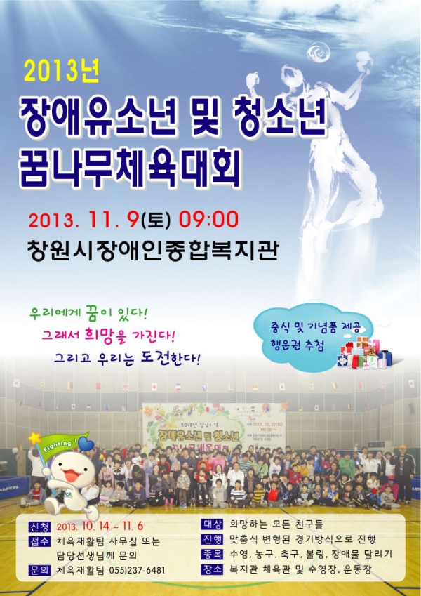 복지관에서 주최하는 "장애유소년 및 청소년 꿈나무체육대회"가 11월 9일 09시에 개최됩니다.