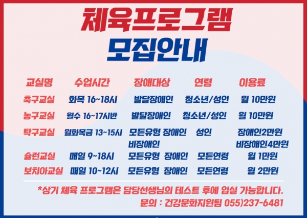 공지사항 2025년 체육프로그램 이용자 모집 안내 페이지 정보 작성자 김성재 댓글 0건 조회 1,764회 작성일 24-12-04 11:52 본문 다음과 같이 2025년 체육프로그램 이용자를 모집합니다.많은 접수 부탁드립니다. 이전글[모집] 2025 문화예술아카데미 이용자 모집 안내 24.12.11 다음글2025년 식자재 납품업체 선정 입찰 공고 24.12.02 목록 댓글목록 댓글목록 등록된 댓글이 없습니다.
