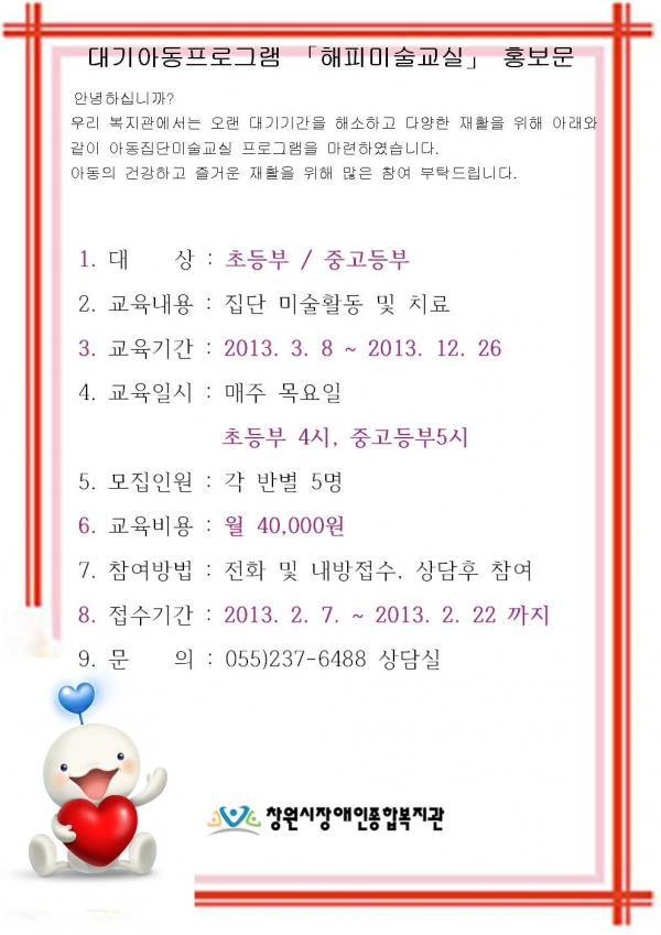 공지사항 대기아동프로그램 「해피미술교실」 모집