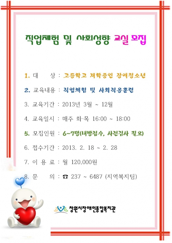 공지사항 직업체험 및 사회성향 교실 모집