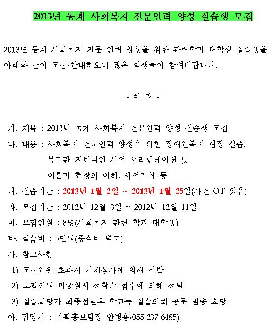공지사항 2013년 동계 사회복지 현장 실습생 모집 안내 페이지 정보 작성자 안병용 댓글 0건 조회 10,319회 작성일 12-11-30 10:19 본문 . 이전글2012년 창원시장애인종합복지관 개관 11주년 기념행사 12.12.03 다음글2012 전체자원봉사자 교육 및 간담회 12.11.27 목록 댓글목록 댓글목록 등록된 댓글이 없습니다.