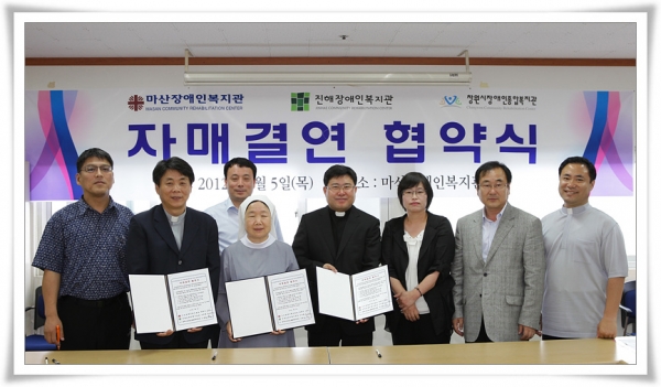 어제 7월 5일(목)에 통합창원시에 있는 마산장애인복지관(관장 곽준석), 진해장애인복지관(관장 이주형), 창원시장애인종합복지관(관장 이정일)의 관장님과 직원들이 한데 모여 자매결연 협약식이 있었어요.