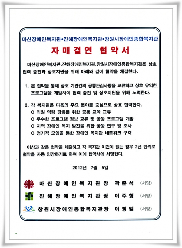 지난번에 있었던 통합창원시 장애인복지발전을 위한 관장 간담회의 결실이 맺어졌어요. 앞으로도 더욱 장애인복지 발전을 위한 다양한 교류가 있을 거에요.