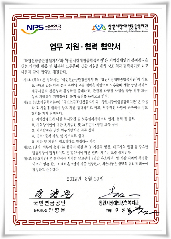 창원시장애인종합복지관과 국민연금공단창원지사는 지역장애인의 복지증진을 위한 다양한 활동 및 행복한 노후준비, 생활지원을 위해 상호 적극 협력하자는 의미로 자리를 마련하게 되었어요.