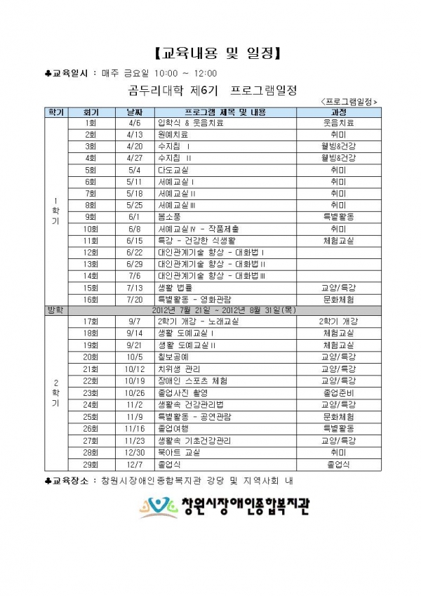 공지사항 장애인과 장애인 가족을 위한「곰두리대학」6기 수강생모집 페이지 정보 작성자 안병용 댓글 0건 조회 9,214회 작성일 12-02-28 16:38 본문 . 첨부파일 곰두리_안내문_2p_(사진포함).hwp (115.0K) 이전글장애자녀를 둔 부모를 위한 미술치료 및 문화교실 모집 안내문 12.03.06 다음글그룹감각통합치료 모집 안내 12.02.23 목록 댓글목록 댓글목록 등록된 댓글이 없습니다.