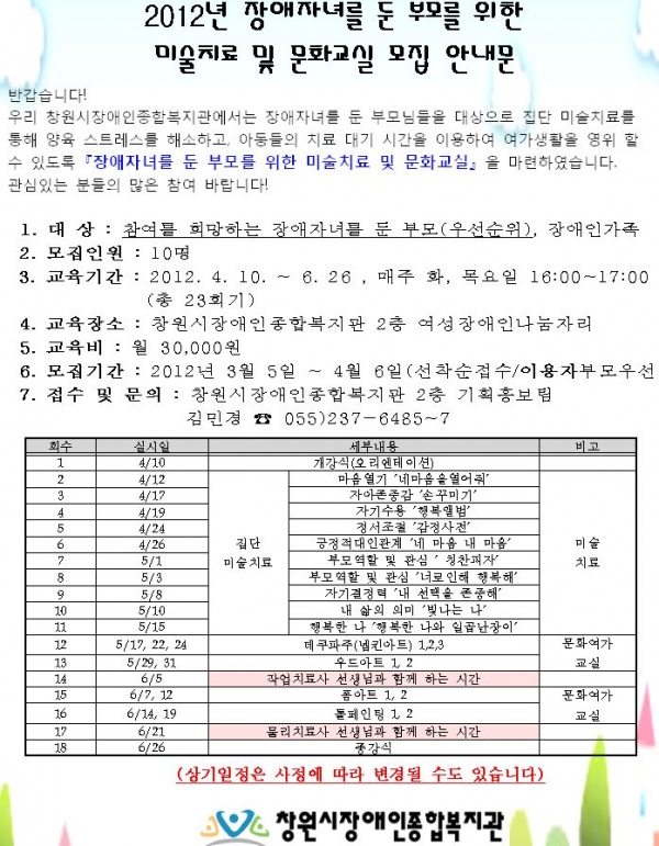 공지사항 장애자녀를 둔 부모를 위한 미술치료 및 문화교실 모집 안내문 페이지 정보 작성자 안병용 댓글 0건 조회 8,939회 작성일 12-03-06 10:51 본문 . 이전글2011년도 창원시장애인종합복지관 세입세출 결산 공고 12.03.07 다음글장애인과 장애인 가족을 위한「곰두리대학」6기 수강생모집 12.02.28 목록 댓글목록 댓글목록 등록된 댓글이 없습니다.