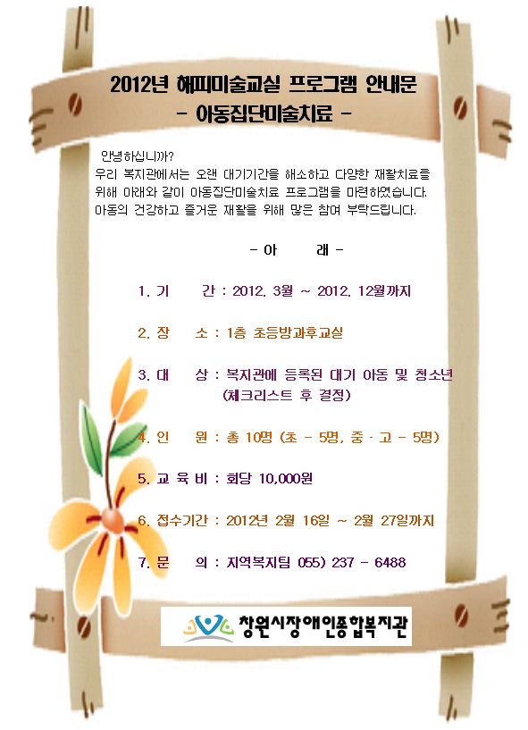 공지사항 2012년 해피미술교실(아동집단미술치료) 프로그램 안내문 페이지 정보 작성자 안병용 댓글 0건 조회 9,801회 작성일 12-02-20 10:30 본문 . 첨부파일 2012년_해피미술교실_프로그램_안내문.hwp (91.0K) 이전글2012 전체 프로그램 봉사자 모집 12.02.20 다음글2012년 대기자 프로그램 안내 12.02.20 목록 댓글목록 댓글목록 등록된 댓글이 없습니다.