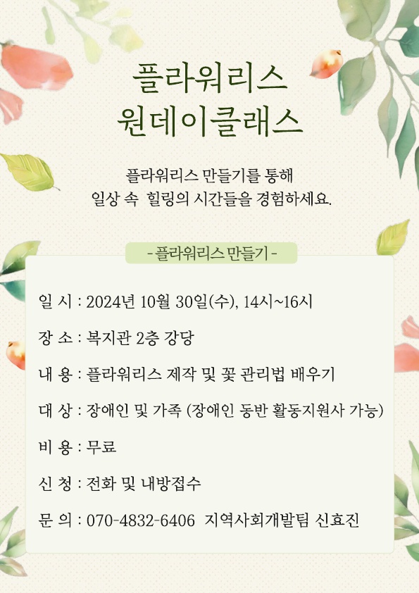 문화여가 기회 확대를 위해서 플라워리스 원데이클래스를 개최합니다