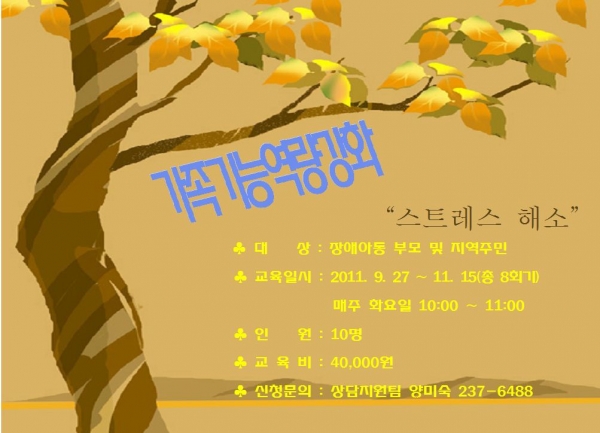 공지사항 부모역량강화프로그램 안내 페이지 정보 작성자 안병용 댓글 0건 조회 10,135회 작성일 11-09-21 11:11 본문 . 이전글제1차 수중재활운동(WATSU 1자격검증 전문가)양성교육 참가 모집 11.09.30 다음글찾아가는 문화공연 안내 11.09.09 목록 댓글목록 댓글목록 등록된 댓글이 없습니다.