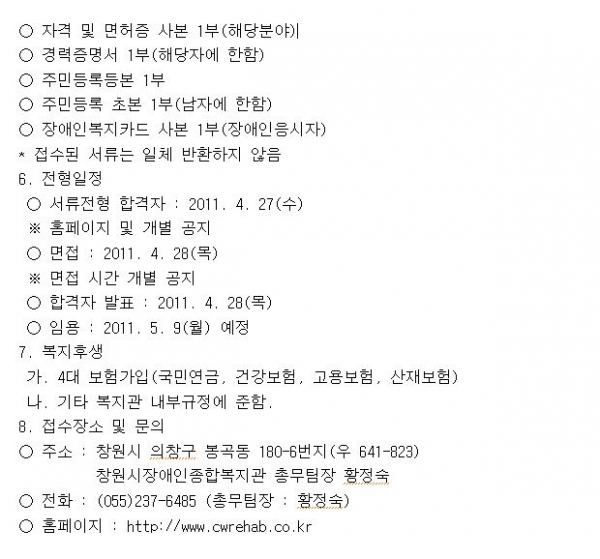 공지사항 창원시장애인종합복지관 계약직 직원채용 모집 공고 페이지 정보 작성자 안병용 댓글 0건 조회 10,142회 작성일 11-04-12 15:22 본문 첨부파일 입사지원서.hwp (19.0K) 이전글"뭐가 보이니?" 가족기능역량강화 프로그램 안내 11.04.26 다음글곰두리대학 제5기 개강식 실시 안내 11.04.06 목록 댓글목록 댓글목록 등록된 댓글이 없습니다.