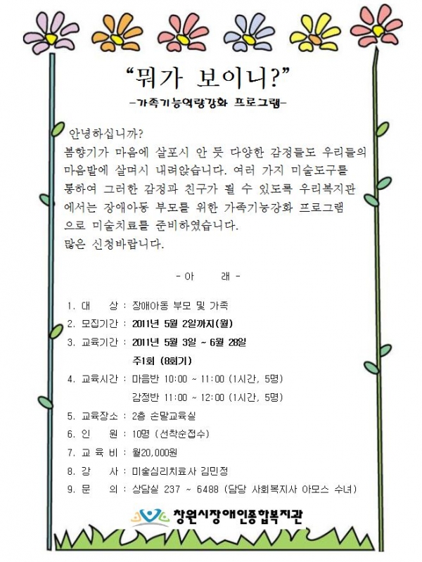 공지사항 "뭐가 보이니?" 가족기능역량강화 프로그램 안내 페이지 정보 작성자 안병용 댓글 0건 조회 11,024회 작성일 11-04-26 13:42 본문 . 이전글종사자를 위한 수중물리치료 교육 11.04.27 다음글창원시장애인종합복지관 계약직 직원채용 모집 공고 11.04.12 목록 댓글목록 댓글목록 등록된 댓글이 없습니다.