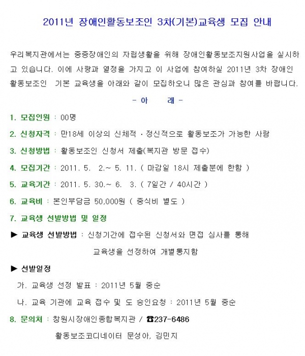 공지사항 2011년 장애인활동보조인 3차(기본)교육생 모집 안내