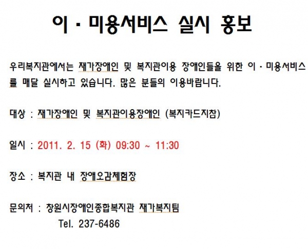 공지사항 2월 이미용서비스 안내 페이지 정보 작성자 안병용 댓글 0건 조회 11,057회 작성일 11-02-09 09:56 본문 . 이전글120봉사회 순회봉사활동 11.02.11 다음글재가장애인 안경지원 사업 홍보 11.02.09 목록 댓글목록 댓글목록 등록된 댓글이 없습니다.