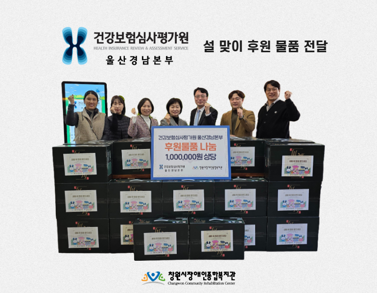 2월 3일 화요일, 건강보험심사평가원 울산경남본부(본부장 서희숙)에서 복지관을 방문하여 설 맞이 100만원 상당의명절 선물 세트(김 선물 세트)를 후원해주셨습니다.후원 물품 전달식 이후 건강보험심사평가원 울산경남본부 임직원 여러분이 장애인 가정을 직접 방문하여 후원물품을 전달하였습니다.