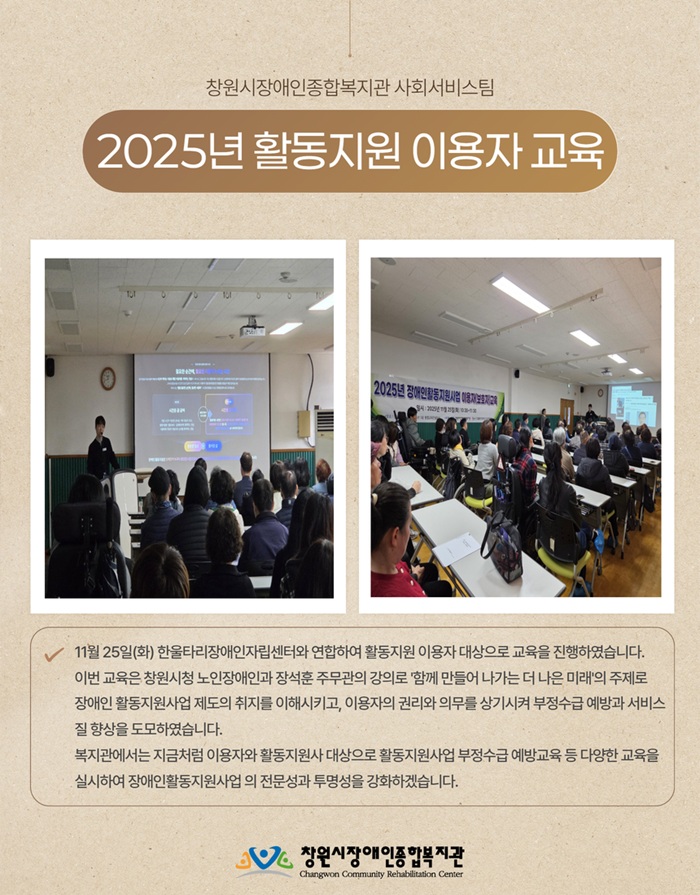 11월 25일(화) 한울타리장애인자립센터와 연합하여 활동지원 이용자 대상으로 교육을 진행하였습니다.이번 교육은 창원시청 노인장애인과 장석훈 주무관의 강의로 '함께 만들어 나가는 더 나은 미래'의 주제로 장애인 활동지원사업 제도의 취지를 이해시키고, 이용자의 권리와 의무를 상기시켜 부정수급 예방과 서비스 질 향상을 도모하였습니다.복지관에서는 지금처럼 이용자와...