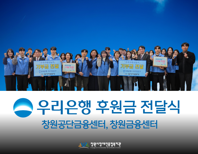 지난 11월 26일 수요일, (주)우리은행 창원공단금융센터와 창원금융센터가 창원시장애인종합복지관을 방문하여 400만원의 기부금을 전달했습니다.전달된 기부금은 복지관의 개관 기념행사(생활체육대회) 진행과 더불어 저소득 장애인 및 취약계층 지원을 위해 소중히 사용될 예정입니다.기부금 전달식 후에는 (주)우리은행 임직원들이 직접 봉사활동에 참여하여 나눔의 의미...