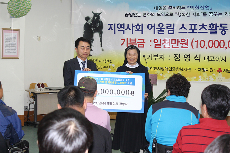지난해 사회복지공동모금회 지정기탁사업 지원금 2천만원을 저희 복지관에 전달해 주셨던 범한산업(주) 정영식 대표이사님이 올해에도 “지역사회 어울림 스포츠활동 지원사업”으로 1천만원을 지정기탁해 주셨습니다.