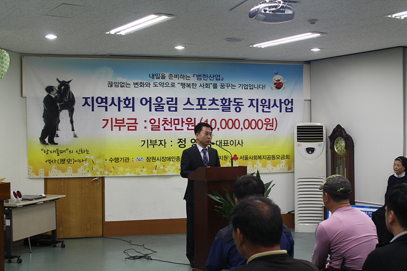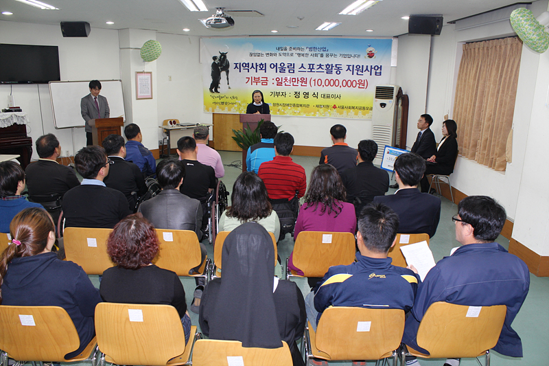 4월 9일(목), 2014년 서울사회복지공동모금회 지정기탁사업으로 진행되는 “지역사회 어울림 스포츠활동 지원사업”의 사업설명회와 지정기탁금 전달식이 진행되었는데요. 지정기탁금 전달식에 범한산업(주) 정영식 대표이사님께서 직접 오셔서 전달식과 어울림 스포츠활동 지원을 받게 되는 휠체어장애인배드민턴 동호회 분들에게 격려를 해 주셨습니다.