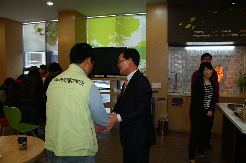저희 복지관과 남다른 애정과 관심이 있으신 의창구청 이기태 구청장님이 기관 방문 오셔서 복지관 동영상 시청, 복지관 현안을 듣고, 장애인바리스타매장인 카페아듬에서 장애인 바리스타가 만든 아메리카노를 한잔 하시면서 환담하였습니다.
