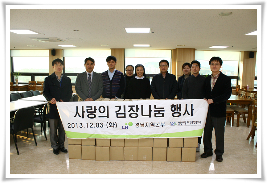 [2013.12.3. LH공사 경남지역본부 김장후원] 아드미에요~~^^ 따르릉~~ 따르릉~~어느 날 복지관으로 반갑게 전화가 걸려왔습니다.LH공사 경남지역본부에서 온 전화였는데요.다가오는 겨울에 어려운 이웃에게 도움을 드리고자 LH공사 경남지역본부에서 전 직원들이 참여하여 담근 김장김치를 복지관으로 전달해 드리고 싶다는 내용의 전화였습니...