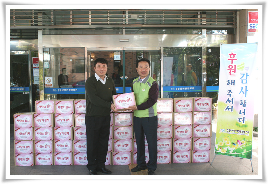 (재)좋은데이사회공헌재단 석수근 본부장님과 창원시자원봉사단체협의회 신문현 회장님이 저희 복지관을 11월 21일(목)에 방문하여, 창원시와 (재)좋은데이사회공헌재단이 후원하고 창원시자원봉사단체협의회에서 주최하는 『사랑의 김치』 50BOX를 저희 복지관에 기증하여 주셨습니다.