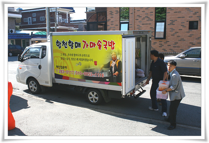 [2013.9.27. 합천할매 가마솥국밥]아드미에요~~^^지난 27일 금요일에 “합천할매 가마솥국밥”조순자 할머님께서 점심제공으로 국밥을 나눠주셨습니다.매번 국밥을 먹을 때마다 할머님의 찐~~~한 국물맛에 감탄을 하게 되는군요.복지관 이용장애인과 가족들의 든든한 점심을 챙겨주기 위해 변함없고 아낌없이 주시는 조순자 할머님의 사랑! 늘 감사합니다.