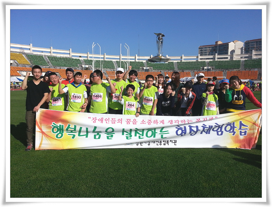 [2013.10.13. 경남마라톤대회 참가] 아드미에요~~^^ 선선한 바람 불어오는 가을에 땀 흘려 뛰어보는 건 어떨까요?지난 13일 일요일에 창원스포츠파크 일대에서 진행된 제10회 경남마라톤대회에 저희 복지관 재활체육교실 입실 학생과 가족 분들이 42.195km를 달리는 느낌으로 6km 건강마라톤에 도전하였습니다.참가한 우리 복지관 친...