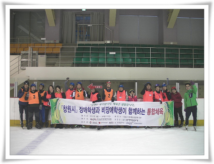 [2013.10.12. 통합체육 스케이트 체험학습] 아드미에요~~^^ 2013년 창원시 장애학생과 비장애학생이 함께하는 통합체육 프로그램에 참가한 학생들의 스케이트 체험학습소식을 알려드릴께요^^지난 10월 12일(토)에 창원서부스포츠센터 내 빙상장에서 장애학생 11명과 비장애학생 2명, 그리고 지도자 및 봉사자 2명이 참가한 가운데 스케...