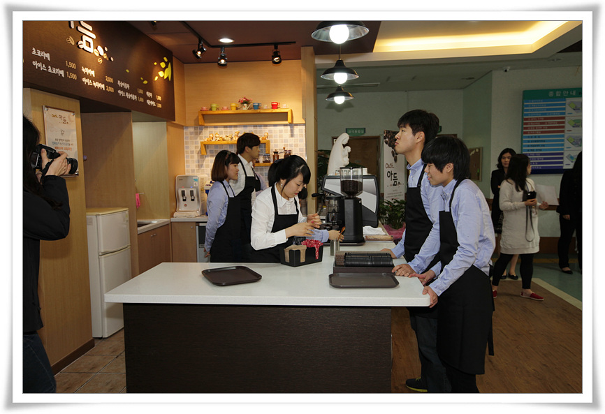 드디어 경남사회복지공동모금회 지원사업으로 진행중인 중증장애인의 성공적인 진로설계 및 직업훈련을 위한 ‘바리스타교육과정’의 일환으로 ‘Cafe 아듬’을 Open하게 되었습니다.