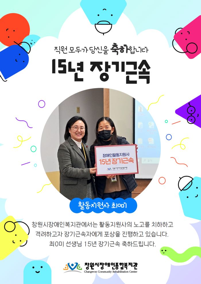 창원시장애인종합복지관 사회서비스팀에서는 장애인 활동지원사들의 장기근속에 따른 노고를 취하하고, 격려하고자 장기근속자(15년, 10년, 5년)에게 포상을 진행하고 있습니다.2024년 1분기, 2분기 활동지원사들의 장기근속자 15년 1명, 10년 1명, 5년 7명에게 기념품 및 포상금을 전달과 활동에 따른 응원, 격려하는 시간을 가졌습니다.앞으로도 우리 복지관...