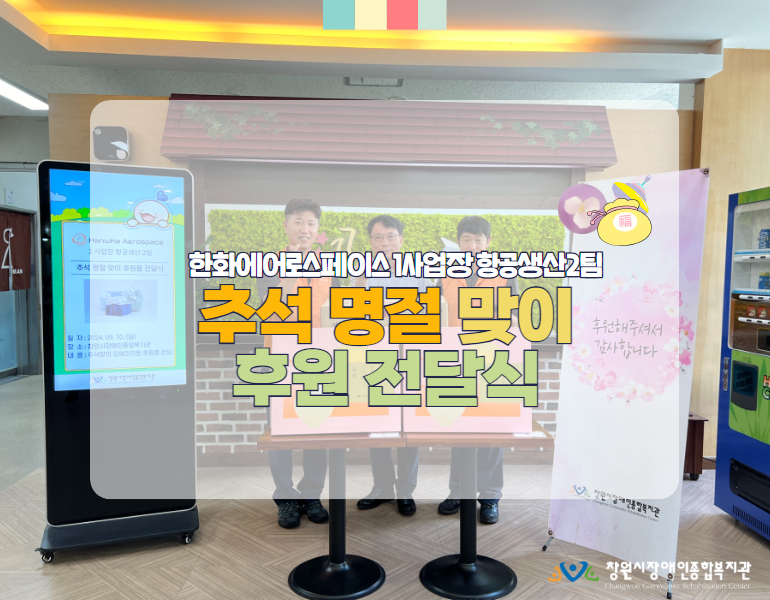 지난 9월 10일, 한화에어로스페이스 1사업장 항공생산 2팀이 창원시장애인종합복지관을 방문하여 지역 내 저소득 장애인과 근로 장애인을 위한 풍성한 추석 명절 선물 세트를 후원해 주셨습니다. 근로 장애인 분들께는 명절의 기쁨까지 선사할수 있었던 마음까지 따뜻해진 뜻깊은 나눔 이었습니다 :)지역 내 나눔문화를 확산하고 장애인근로자의 자립을 지원하기 위해 많은 ...