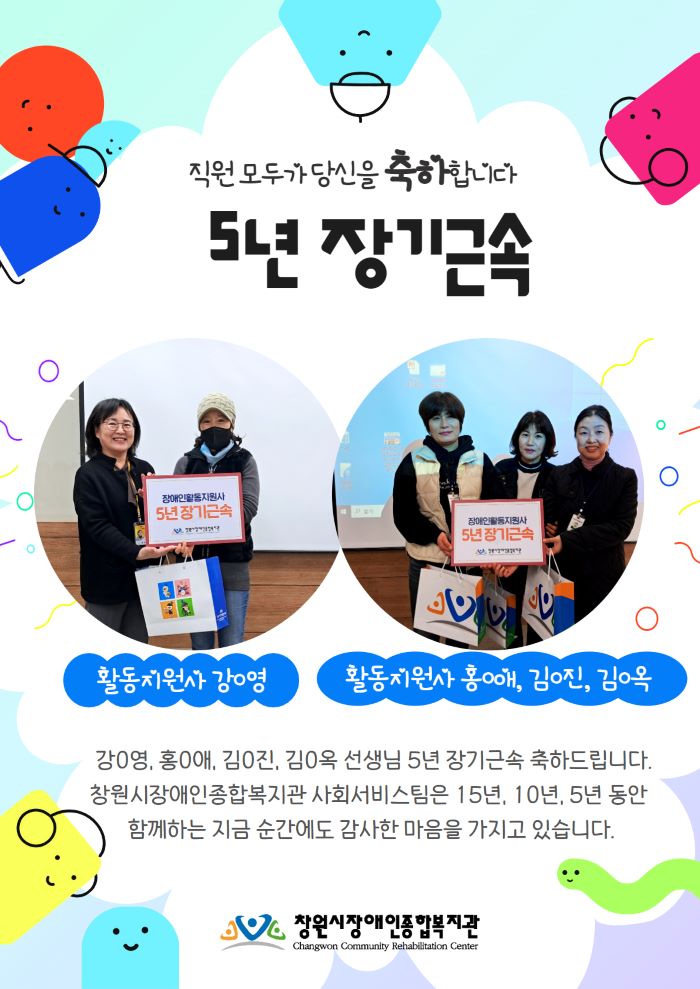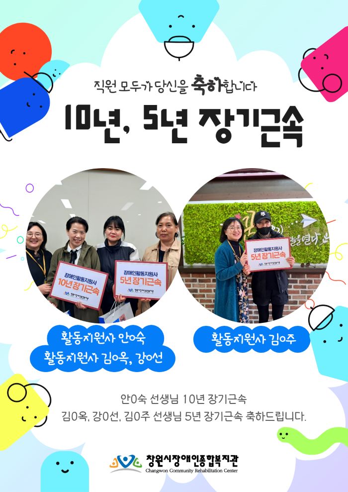 창원시장애인종합복지관 사회서비스팀에서는 장애인 활동지원사들의 장기근속에 따른 노고를 취하하고, 격려하고자 장기근속자(15년, 10년, 5년)에게 포상을 진행하고 있습니다.