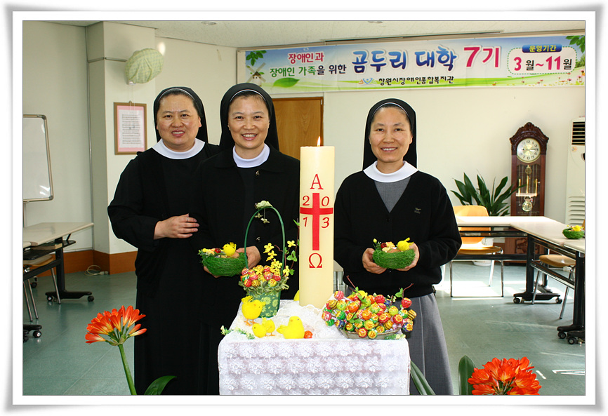 [2013.4.1. 부활축하] <?xml:namespace prefix = o ns = "urn:schemas-microsoft-com:office:office" />아드미에요~~^^ 예수님 부활을 맞이하였네요.아침 주간조회시간에 정영숙 관장수녀님과 두분의 수녀님께서 손수 만드신 부활선물을 직원들에게 나눠주셨어요. 만드신다고 수고 많으셨거든...