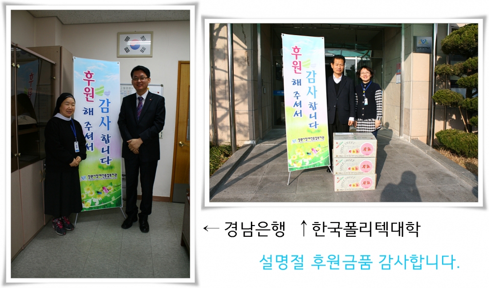 오늘은 경남은행 본점에서 25만원을, 한국폴리텍Ⅶ대학에서 15만원 상당의 사과즙 6박스를 후원해 주셨습니다.